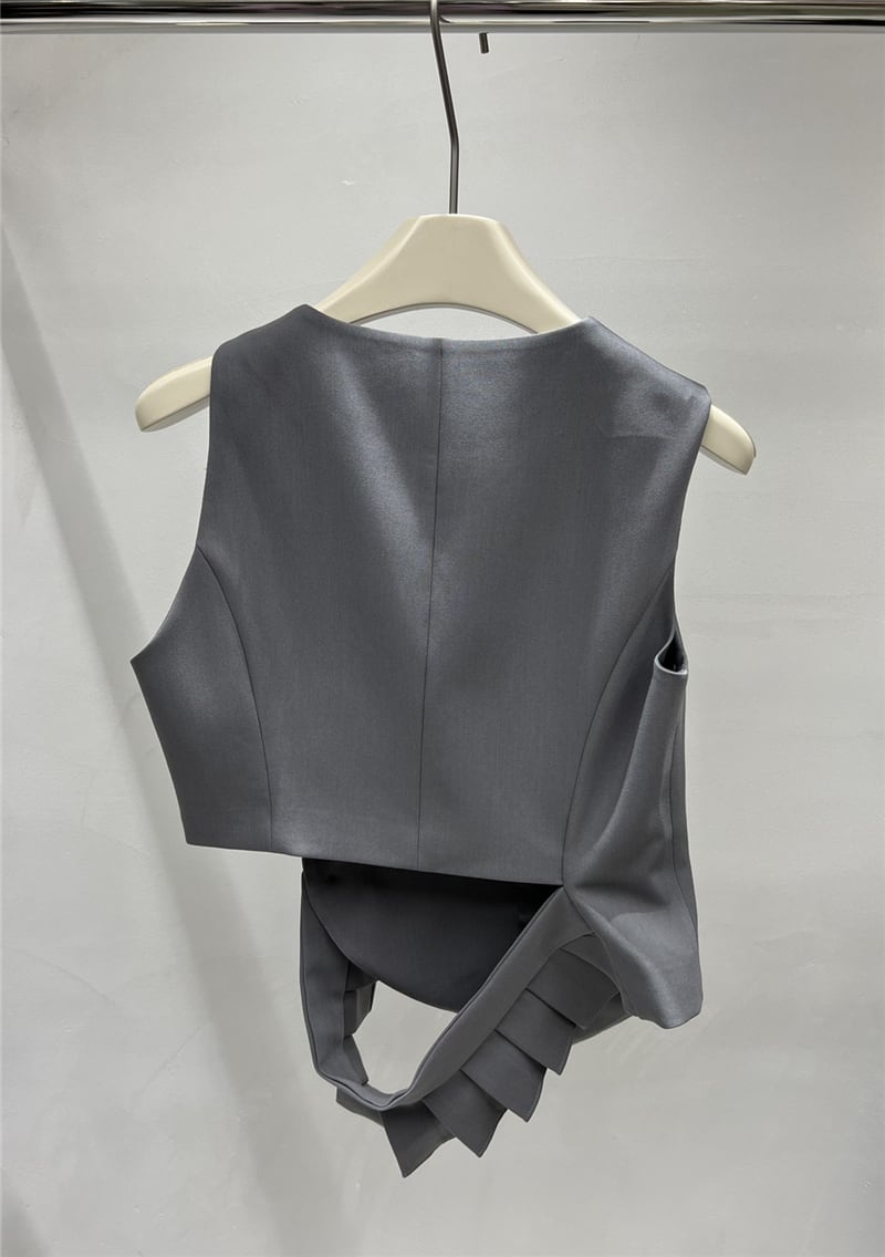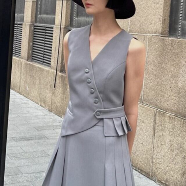 アシンメトリーなデザインが特徴的な斜めボタンのベスト。 ぴったりめなベストは固くみえがちですが、 片側の裾にプリーツデザインを取り入れ、クールの中にも女性らしさも◎ 同じカラーのスカートと合わせるとセットアップコーデになります。 スカート: 【サイズ】 S 肩幅:31cm 胸囲:86cm 着丈:34.5cm M 肩幅:32cm 胸囲:90cm 着丈:35.5cm 【カラー】 ブラック グレー 【素材】 ポリエステル ■お届けについて こちらの商品は海外より直接発送となる為、ご入金から2~4週間前後で発送致します。 ※タイミングによっては 商品在庫切れにより注文キャンセルとさせていただく恐れもございますので、予めご了承くださいませ。 ■注意事項 ・手作業による計測のため実際のサイズと1~3cm程度の誤差がある場合がございます。 ・こちらは海外製品のため縫製が甘いことやしわがついていることがありますが、重大な不良品に該当しない場合返品対象外となります。 ・仕入れ工場が変更になることがあるため、商品の使用が若干異なる場合がございます。 ・商品写真は照明やお使いのスクリーンの設定によって実物の素材感や色味とは違って見える場合がございます。 ・イメージ違いやサイズ交換等、お客さまご都合による交換、返品は対応出来かねます。 ———————————— ご購入前にこちらをお読みください https://www.denity.jp/about ————————————