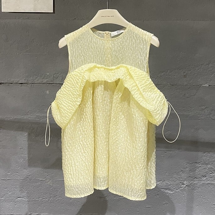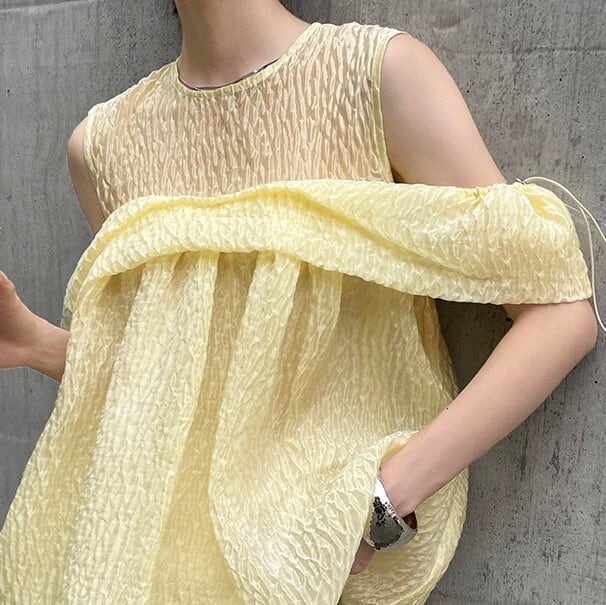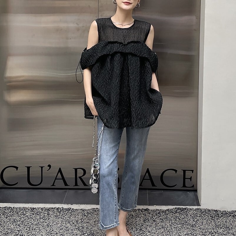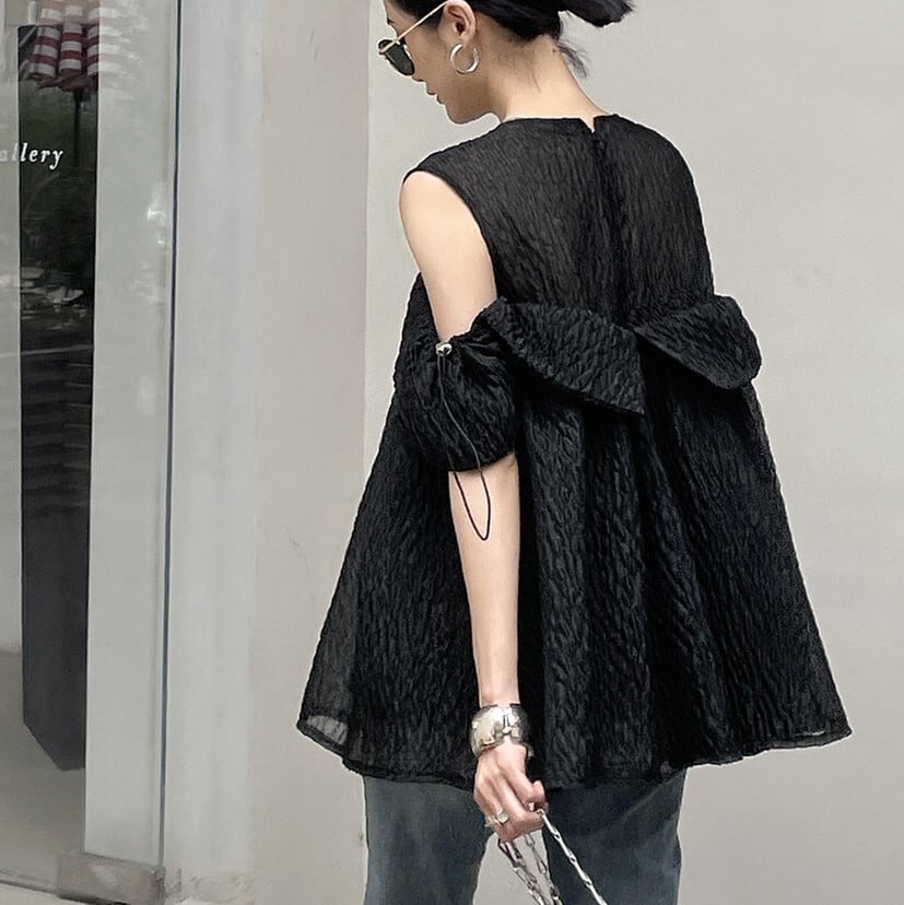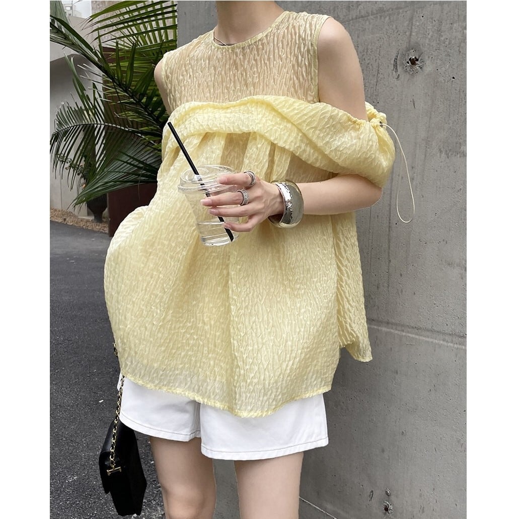 表面に凹凸を出した生地を使用したオフショルダーシャツ。